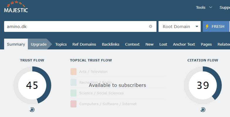 Hvis vi ser på Majestic.com så har Amino.dk både et god Trust og Citation Flow på henholdsvis 45 og 39