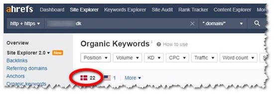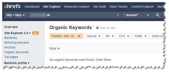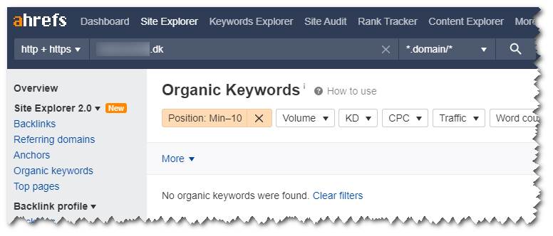 Ovenstående domæne virker som sagt lidt mistænkeligt. Så lad os se på om det overhovedet ranker på noget. Det kan vi også tjekke i Ahrefs.com …