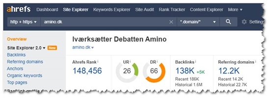 Hvis vi f.eks. ser på Amino.dk så har domænet en DomainRating på 66