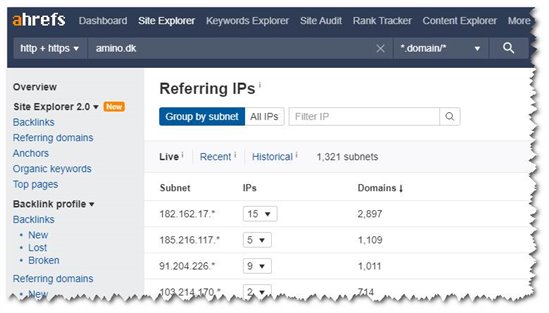 Som udgangspunkt grupperer IP-rapporten i Ahrefs.com alle IP-adresser på IP-subnets. I denne sammenhæng er IP-subnets defineret som IP-adresser der alle ligger på et IP-nummer hvor de første tre tal-sektioner er ens.