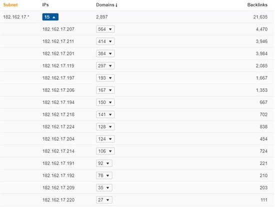 Hvis vi f.eks. ser på det første subnet på listen så er der links fra domæner der ligger på 15 forskellige IP-adresser. De starter alle med 182.162.17