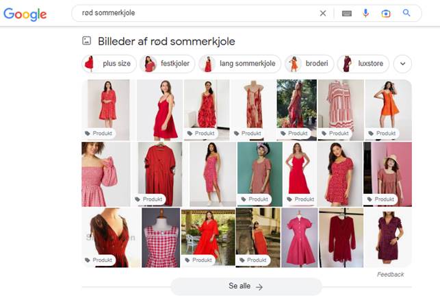 Her er et eksempel på en søgning på ”rød sommerkjole”. Når man lige scroller forbi annoncerne, er det første store søgeresultat-område 100% billeder.