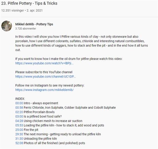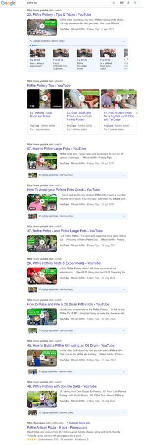 Her er et eksempel på en søgning på ”pitfire tips” (pitfire er en keramisk teknik, som jeg roder en del med og har lavet mange videoer om).