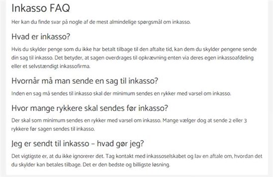 Derudover det meget vigtigt, at FAQ- og ordbogs-sektioner er opbygget med spørgsmål og svar på hver sine sider. Hvis det hele ligger samlet på en enkelt side – med f.eks. en folde-ud funktion, så vil det ikke have den ønskede effekt i Google.