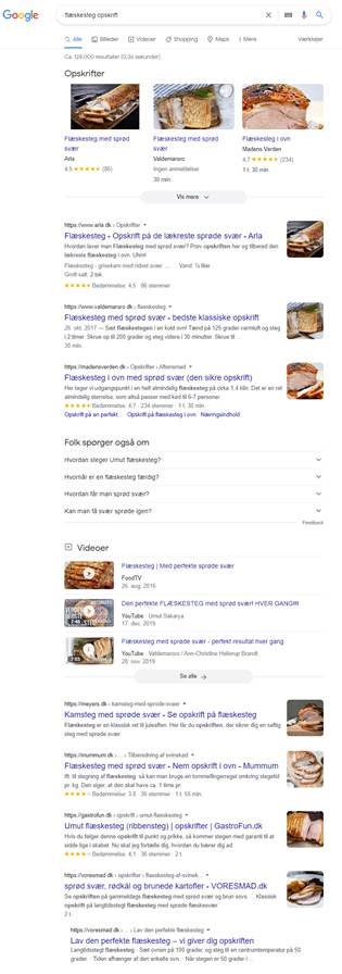 Lidt længere nede er der en sektion med videoer. Dette er også et eksempel på, at Google forsøger at matche din søgning med en indholdstype, som du kunne være glad for. At se en video med hvordan man laver en flæskesteg er jo oplagt godt.