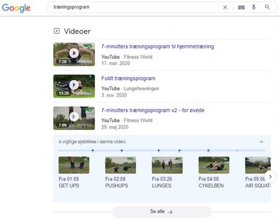 Hvis du f.eks. søger på ”træningsprogram”, dukker der også en blok med videoer op. Logisk nok, for mange vil nok mene, at det er bedre at se en video, end at læse end tekst, når man skal lære at træne rigtigt.