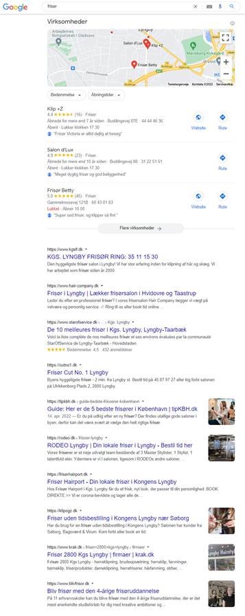 Som du kan se, er det stort set kun frisører i Lyngby – og lister med frisører i Lyngby der dukker op på side 1. Og øverst er Google Maps og de 3 frisører, som Google mener er mest relevante for mig.