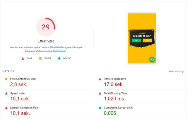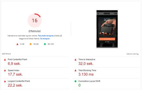 En samlet PageSpeed Score på 16 er absurd ringe!