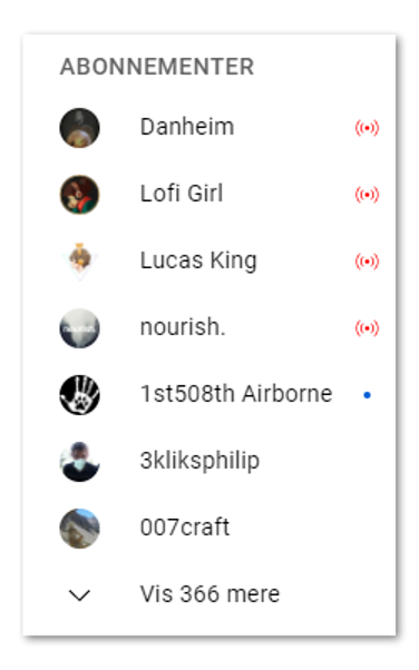 Et eksempel på hvordan “det nye” altid bliver pushet, er fx, når du kigger på listen over hvem du abonnerer på. Listen som du ser på billedet, er at finde på din startside – og her vises de kanaler, som er live lige nu altid først.