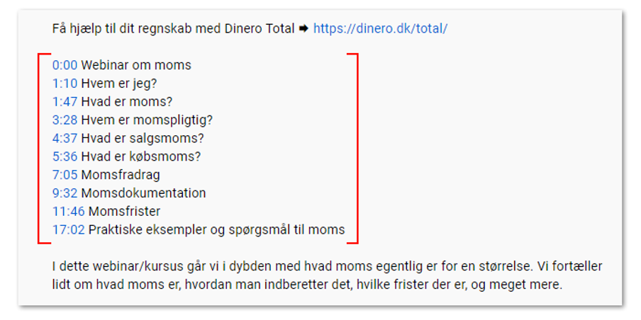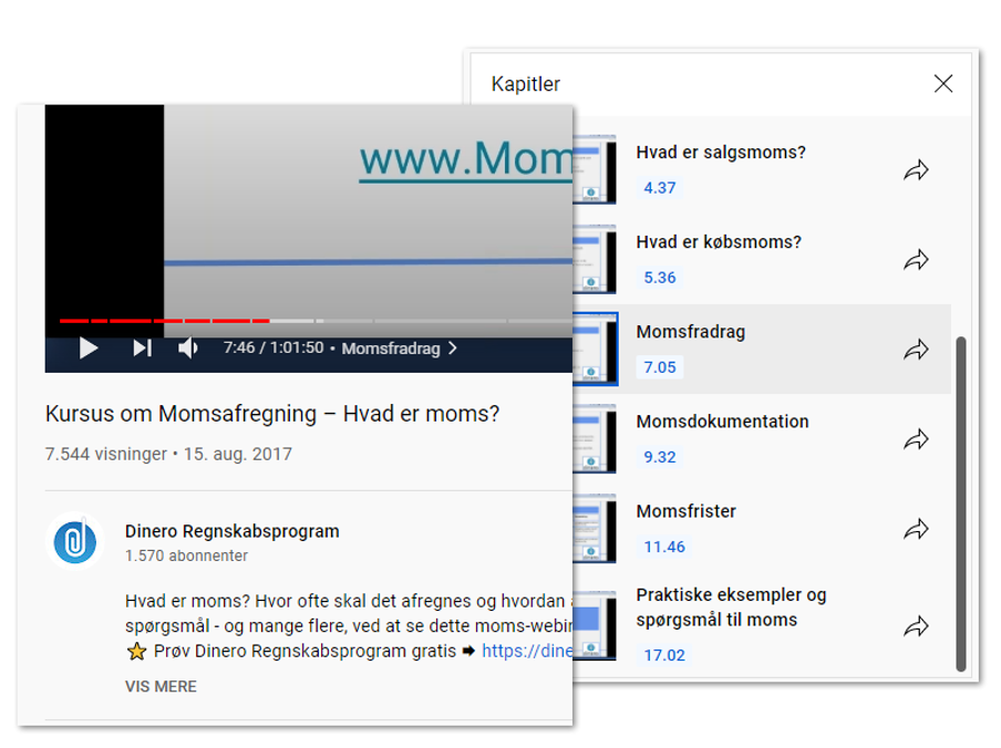 Kapitelfunktionen er en af de nyere funktioner, som er kommet til YouTube. Klikker du ind på Dineros webinarer, som ligger tilgængelige på vores YouTube-kanal, kan du se, hvordan timelange videoer bliver overskueliggjort gennem kapitelfunktionen.