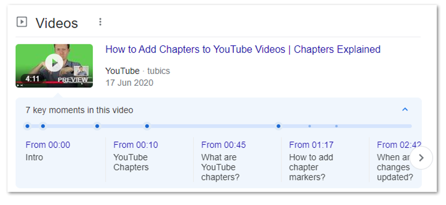 En anden, men lige så stor, grund til at bruge kapitelfunktionen er, at den hjælper med at indeksere din video på Google. Det fortæller nemlig en del om, hvad der sker i videoen. Her er et billede fra en Google-søgning efter, “How to add chapters in YouTube video”: