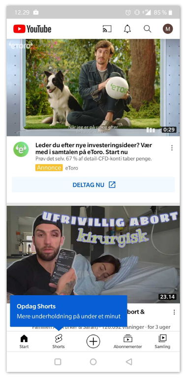 Et andet eksempel er fra så sent som på dagen, hvor jeg skrev det her indlæg. Jeg åbnede min YouTube-app på telefonen og blev mødt med beskeden “Opdag Shorts – Mere underholdning på under et minut”.
