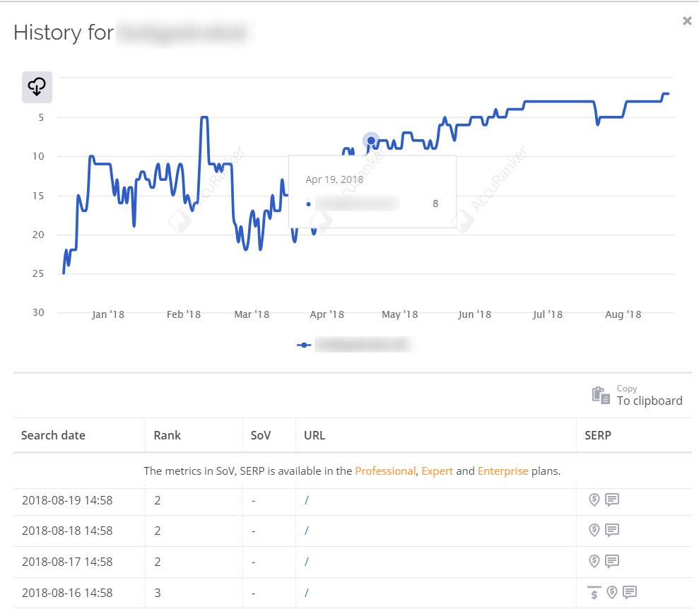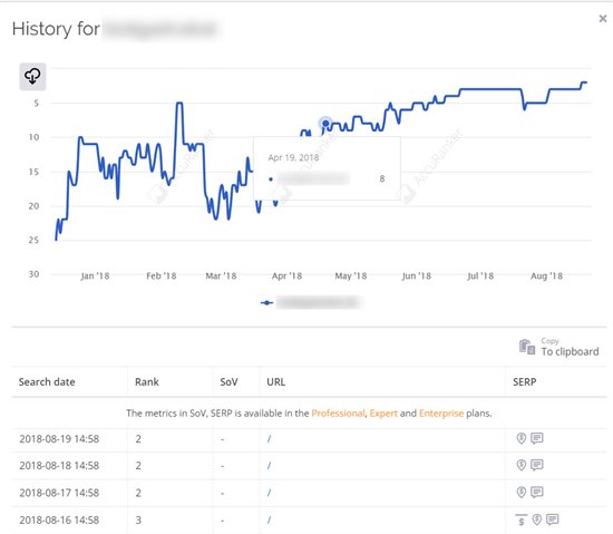 Hans side bouncede faktisk lidt frem og tilbage mellem 2. & 3. pladsen indtil den i juni måned hoppede op på 1. pladsen, hvor den så har været plantet solidt indtil nu (se nedenstående screenshot fra Accuranker)
