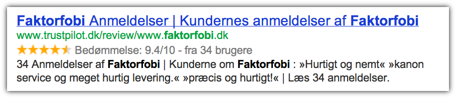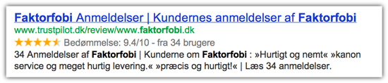 Og ikke nok med det: Nu er din Trustpilot score også med i Google SERP. Her kan du se, hvordan det ser ud, når man Googler Faktorfobi.