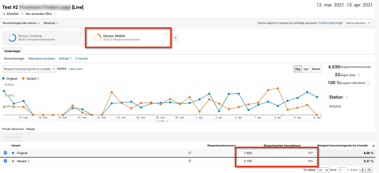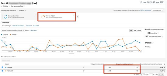 Seneste test jeg gennemførte var der hele 10% forskel. Hvor desktop performede virkeligt godt, var der en lille negativ effekt på mobil. Så at implementere den variation, ville altså skade konverteringen på mobil. Og på nogle sites idag er vi oppe på 60-80% mobil trafik, så det er ikke ligegyldige forskelle.