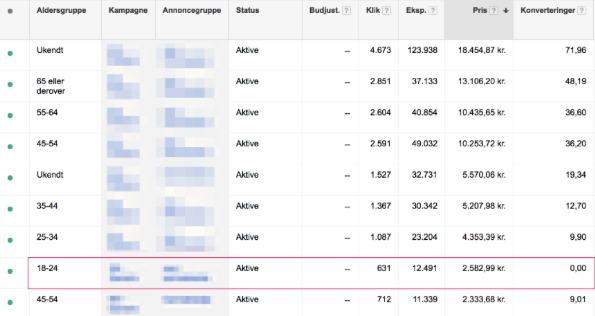 På en af vores nye kunders konti kunne jeg fx. se en målgruppe der havde brændt over 2.500,- kr af på over 600 klik. Resultatet? 0 konverteringer.