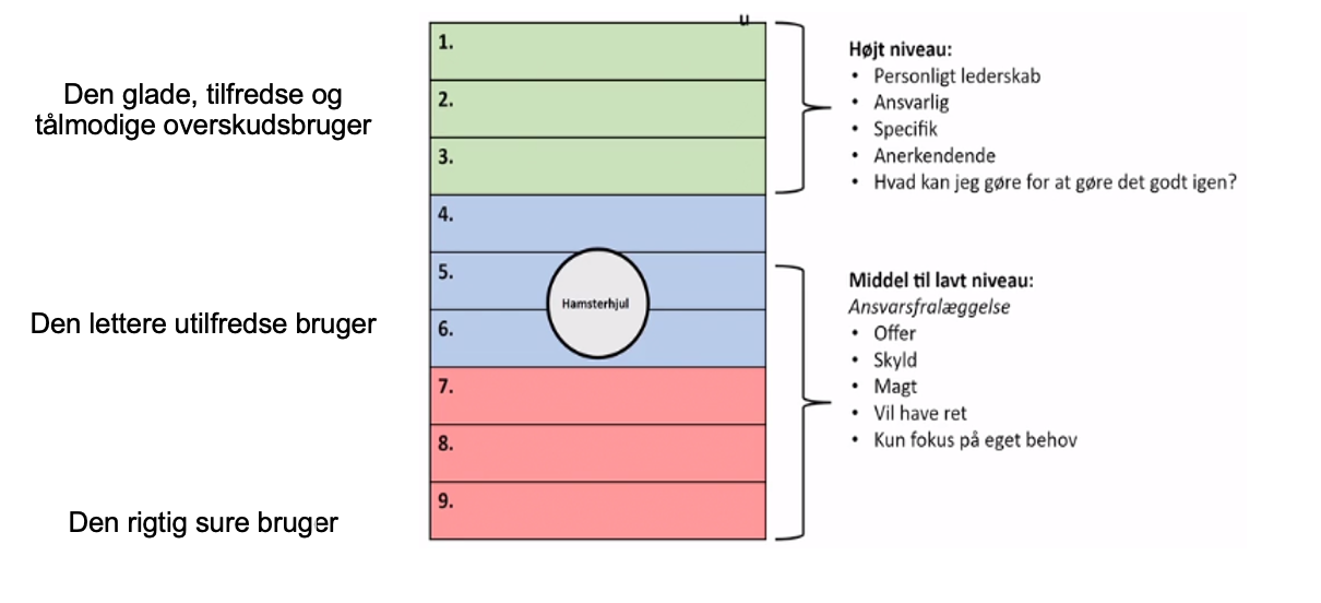 I det næste afsnit vil jeg fokusere på de tre nederste niveauer, hvor den rigtig sure bruger befinder sig – indtil vi har fået vendt situationen.