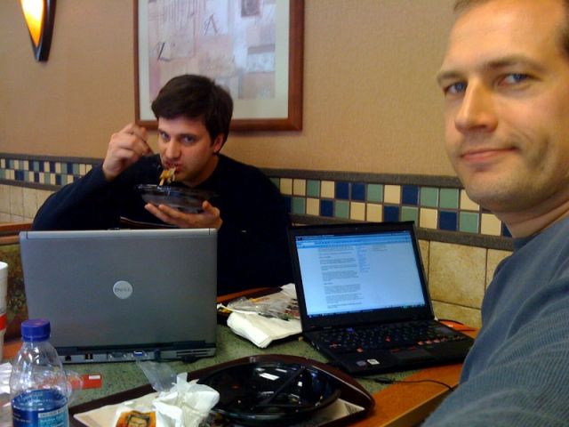 John og Thorborg svarer support og skriver blog, mens John spiser... :-)