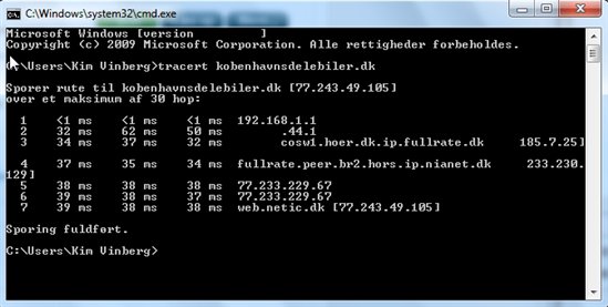 Når det er startet skal du skrive "tracert kobenhavnsdelebiler.dk" - og tryk enter. Det den så kommer frem med vil forhåbentlig fortælle en smule, der kan bruges til at finde løsningen. Send et screen shot til mig eller teksten i en privat besked.