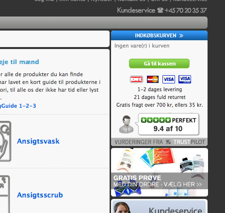 Og når vi nu har sagt næste test, så kan vi lige så godt sætte den igang. Jeg har flyttet placeringen af mærkningerne ned i vores kundeservice boks, stadig i højre side, men lidt lavere, og for de fleste under folden. Derudover har jeg valgt at fjerne linket fra såvel e-mærket som trustpilot for at teste denne effekt. Der er stadig ikke nogen mærkning i checkout forløbet, da det ikke er det jeg ønsker at tjekke. Derudover har Trustpilot henvendt sig for at spørge om jeg ville bruge en anden widget. Det har jeg accepteret da jeg også anvender den seneste grafik fra e-mærket. Og da jeg ligger nr. 1 under hudplejeshops, har jeg anvendt dette i min widget.