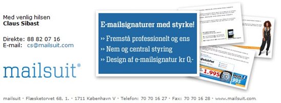 Hej Mark hvis du kopier teksten fra en mail, og indsætter den i en anden, kommer afsender adressen altså ikke med. Du kan selvfølgelig heller ikke være sikker på at din signatur kommer med, men hvis den gør, så er det rart at adressen er med. Jeg har førhen haft en medarbejder til at gennemgå flere indkomne mail, fra flere forskellige personer og sorteret i data, sendt det som jeg var interesseret i videre til mig i en samlet mail. Så er det rart at have kontakt info til brug med det samme. Hvis det var min omsætning der evt. kunne afhænge af om der er mail i min signatur ville jeg ikke være i tvivl. Når det er sagt, har jeg idag heller ikke mailadresse i min signatur. Men hvis jeg sender noget tilbuds materiale til en større koncern, vælger jeg altid at sætte den ind alligevel. bare for en sikkerheds skyld. KMosen |