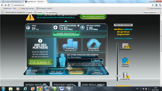 Hejsa, Jeg har store problemer med netværket på 3. Det har aldrig været så dårligt som nu. Det er næsten umuligt at se en Youtube video, og download og upload er meget ringe. Ligeså oplever jeg oftere og oftere der ikke er nogen tele forbindelse. Jeg har været 3 kunde i nu 2 år - men jeg syntes de sidste 6 md er blevet ringere og ringere. Jeg holder til i Helsingør og Espergærde, men har også problemer i København. 3 skriver de har opdateret deres net til 32mb i mit område, men det kan jeg absolut ikke mærke. Er her andre som har disse problemer? Jeg overvejer at skifte til Telia eller TDC som nu har fået 4G- er her nogen som har erfaring med dette? Her er billeder af test resultaterne: speedtest.net 3's egen test: