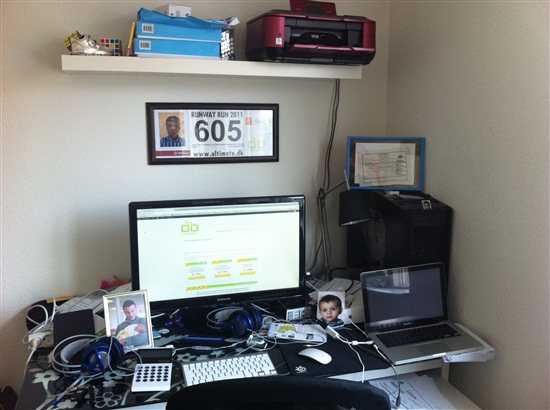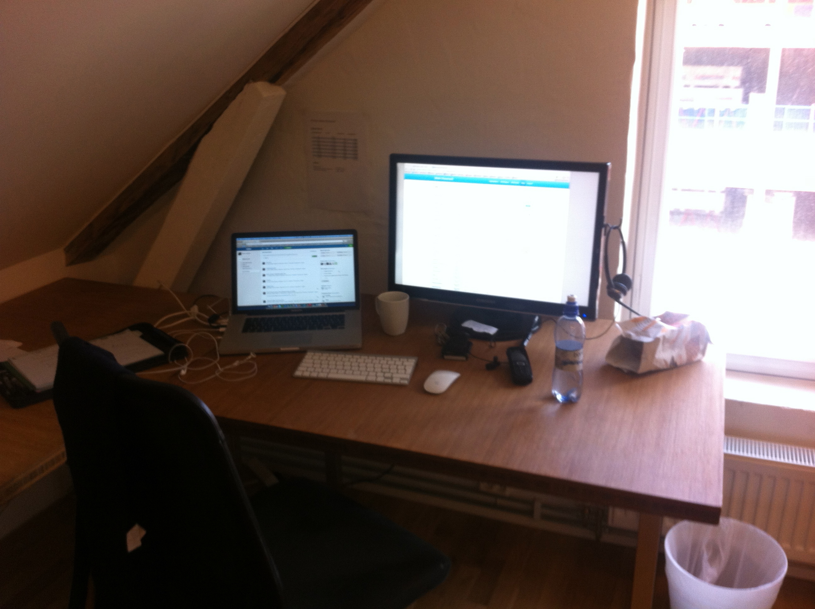 Når nu der er så mange der deler billeder af deres kontor, så må jeg jo hellere være med på trenden også Kontoret er et stort rum, men er delt i en skrivebords del og en møde del. Her er kontor delen. Træskrivebordet er der hvor GlobaCon holder til og det grå skrivebord lånes lige pt. ud til en ven. og her er møde delen, læg mærke til Amino klistermærket på whiteboard tavlen |