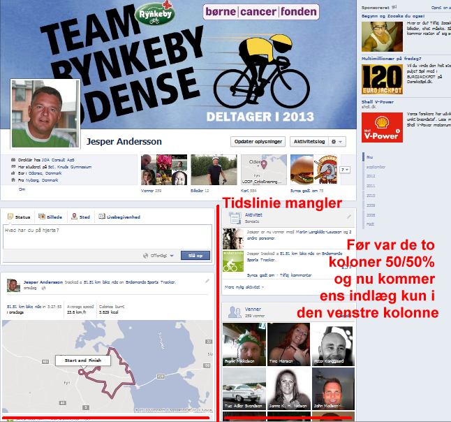 Ned i midten af de to kolonner var tidslinien og du kunne der se hvor du var og tilføje link, billeder m.m. direkte. Nu er det kun i den venstre kolonne (som også er blevet bredre) at ens indlæge slåes op.