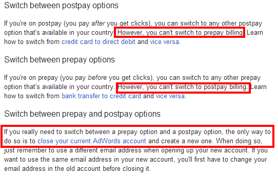 ja, det Google mener, er at du altid kan skifte mellem forskellige former for betalings muligheder men kun inden for samme metode - forud eller bagud betaling.