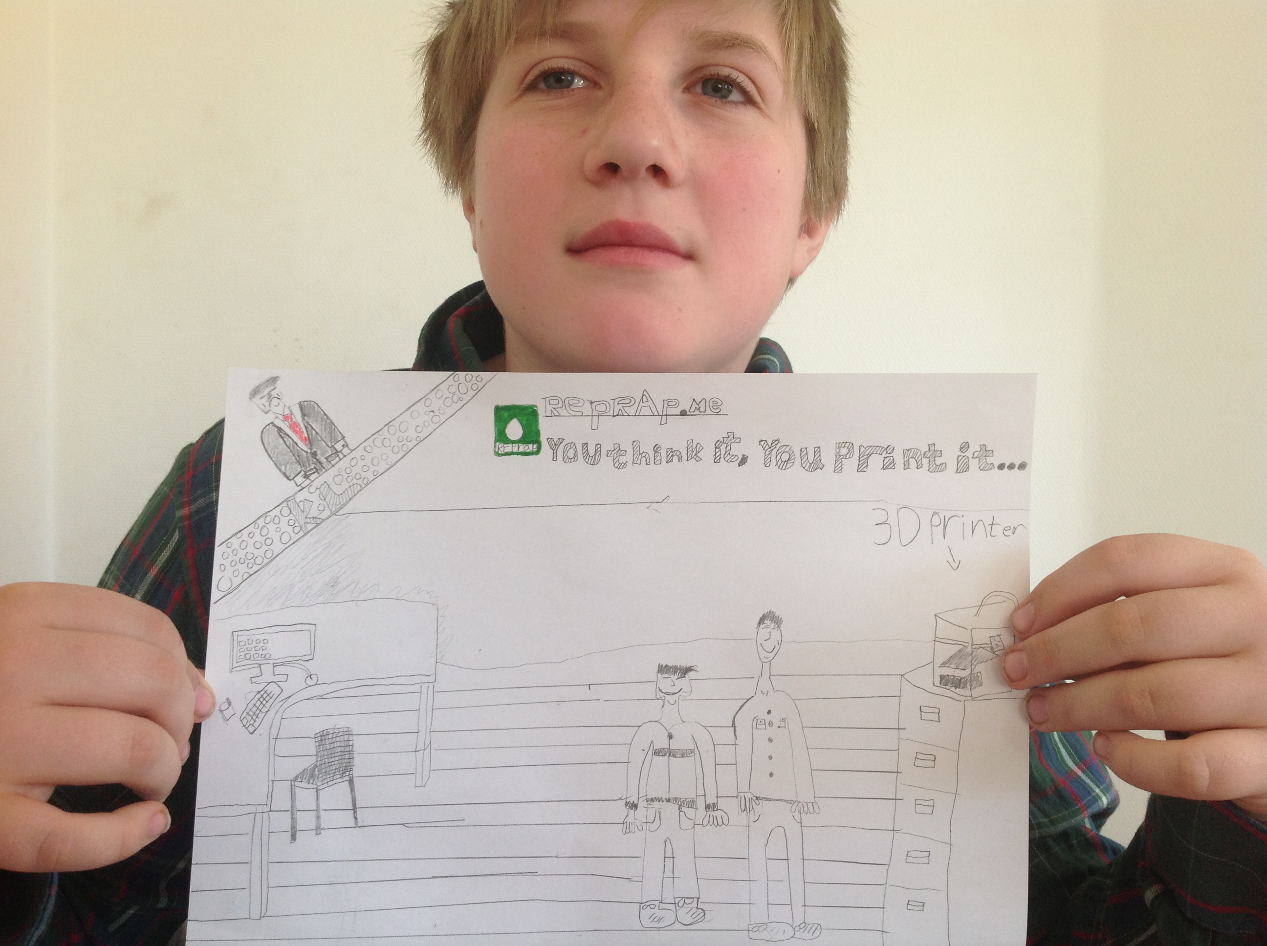 Min søn Victor på 12 år vil gerne vise hans tegning af hans dag i går hjemme i firmaet med far, som laver 3d-printere. Han synes også der i hjørnet skulle være en jakkesæt-klædt sur KL mand, da han er meget glad for at gå i skole.