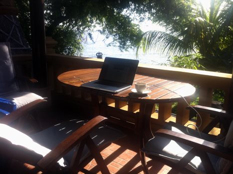 Her sidder (sad) jeg i svigerforældrenes baghave i Vientiane Capital City og arbejder, og der kommer lige et kort glimt af mit skrivebord - dog med sammenklappet laptop.