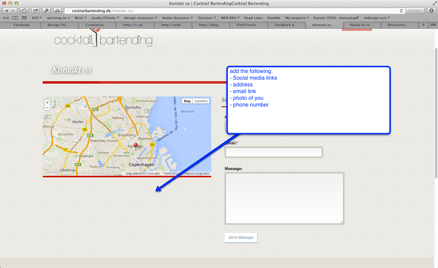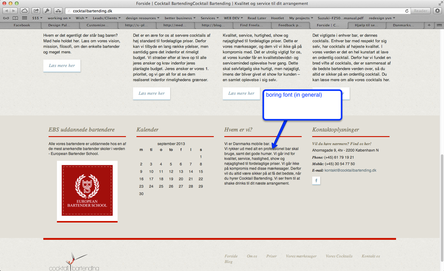 På forsiden synes jeg jeres tekster under de 4 fremhævede emner er for lange, og det ville blive mere overskueligt at læse hvis der var en smule mere linjemellemrum. Jeg snakker her om: Om os, Hvad tilbyder vi, vores mærkesager og vores cocktails.