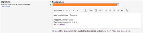 Hej Aminoer. Jeg ved ikke om der er en indstilling jeg har overset, synes nu jeg har siddet og kigget rundt i generelle indstilling, men uden held. Mit problem ligger i, at når jeg i al almindelighed skriver mails til folk, så optræder min signatur altid nederst, også selv om det er en samtale over adskillige e-mails. Signaturene hober sig simpelthen op i bunden og står ikke ud fra hver e-mail jeg skriver. Ved at dette lyder lidt kringlet, men håber en/flere kender problemet og som har et svar. Venlig hilsen Oliver Dönvild |