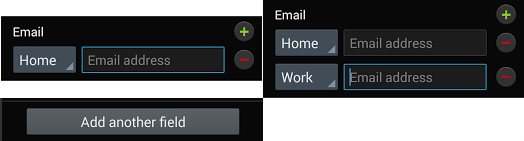Jeg kører selv Android dog med 4.3 og med Samsungs TouchWiz, men jeg kan sagtens tilføje flere emails til én kontakt. Det gør jeg ved at gå ind på kontakten og "scrolle" helt ned i bunden hvor der står "Add another field" eller hvis man har det på dansk "Tilføj et nyt felt" tror jeg, og derefter vælger email. Eller endnu simplere kan jeg bare trykke på det lille grønne kryds, så tilføjer den et nyt felt af samme slags.