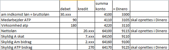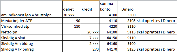 En normal overførsel af løn vil indeholde disse punkter - og nogen gange vil de være simplere hvis arbejdstiden i perioden har været under 31 timer som jeg lige husker det, for så forsvinder atp delen - du kan klikke billedet tror jeg. Ved at oprette de nye konti i Dinero og så sætte danløn til summa bogføringssytem vil du i bogføring danløn få en liste der viser beløb - debet - kredit og konto i summa og i mit billede vil du ha en oversættelse til hvad det er for konto i Dinero TROR jeg bestemt, men det må Dinero support kunne kommentere. At der ex mangler Medarbejder ATP i frift er underligt, virksomheds atp er med - dinero har nok tænkt man bare skrev det under AM indkomst men det er forkert, selve nettolønnen der skyldes til medarbejderen og skyldigt ATP mangler som jeg ser det klart i status for at man - uanset løn system vil kunne lave en korrekt løn bogførsel med ATP til en ansat     - Den var lidt vanskeligt forklaret Casper, men min work-around bør virke og være simplere hvis det er en medarbejder uden ATP hvor der kun vil mangle status konto for selv den skyldige nettoløn (hvis ikke jeg overser den)  vh John H (seer and overseer)