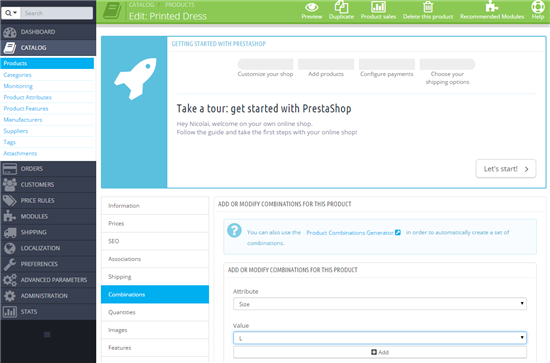 Når du redigerer varen vælger du menu punktet Varianter, eller Combinations på engelsk. Her kan du lave varianter på baggrund af bl.a. størrelse og farve.