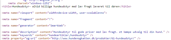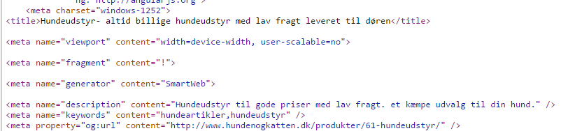 Indsaet et korrekt <Meta title tag> og lav en god description tag hvor hundeudstyr indgaar.