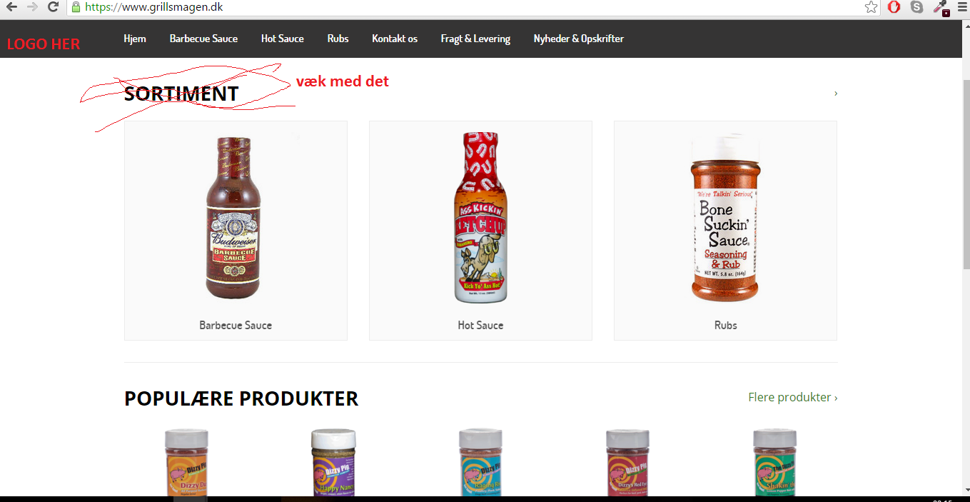 Nu sidder jeg og keder mig, så her et shot for at pointere hvordan jeg gerne vil se siden når jeg åbner den. Dvs. menu logo helt oppe i toppen, de første produkt billeder man ser lige i midten.