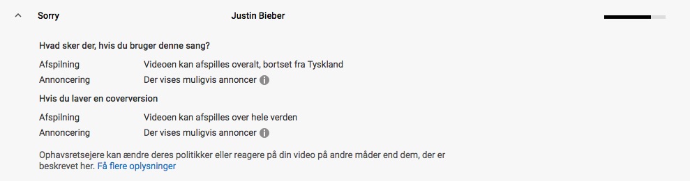 2) Musikken er på en særlig copyright-liste, der tillader brug, men sætter annoncer på dine videoer uden din umiddelbare tilladelse (enhver annonce-fortjeneste på den video vil derfor også tilgå til 'musikerne', og ikke dig). Du kan altså frit bruge musikken, men kan forvente reklamer: