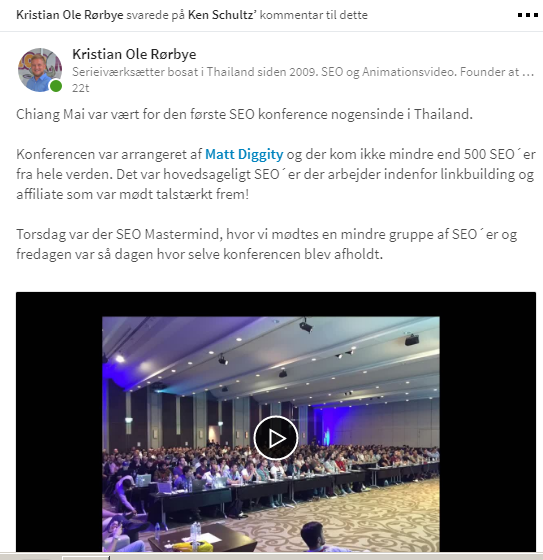 Takker :) En lille update: Da vi startede op herude med SEO for 9 år siden var der stort set ikke andre der lavede det. I denne uge var Chiang Mai så vært for en af de største SEO konferencer i år (hvis ikke den største?) hvor der kom 507 SEOer fra hele verden. Har skrevet lidt om det på LinkedIn: |