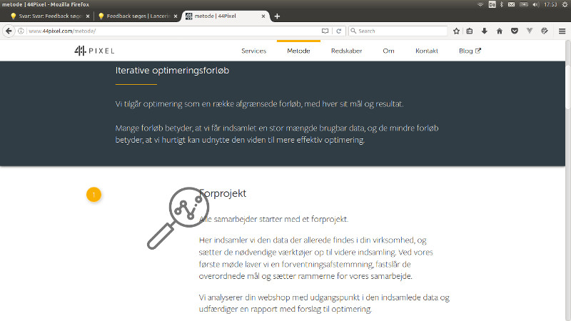 Hej Amino. Vi har lanceret vores nye hjemmeside www.44pixel.com og vil i denne ombæring gerne have input fra jer. Lidt om os: Vi arbejder med konverteringsoptimering af webshops, for at få mest ud af allerede eksisterende trafik, og bruger bl.a. Google Analytics, Hotjar etc. til at give indblik i brugen af webshops. Vi startede virksomhed for snart et år siden, men er nu så selvsikre på, hvad det er vi vil og kan, at det er blevet tid til et rigtigt site. Vores hjemmeside skulle gerne fungere som informationskanal og opfordre potentielle kunder til at ringe til os, eller udfylde vores formular. Vi er specielt interesseret i om budskabet leveres på en forståelig måde, om der er elementer som ikke fungerer, eller noget helt tredie. |