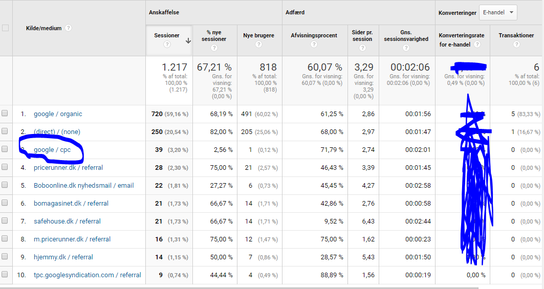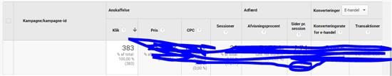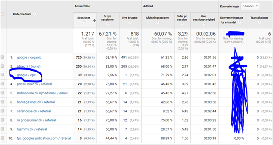 Hej Amino. Efter vi er skiftet til et nyt webshop system, tracker vores Analytics konto ikke vores Google AdWords traffik korrekt. Hvis man går ind på vores Analytics under anskaffelse>Adwords>kampagner, ser man nedenstående traffik fra igår: Hvis man så går ind under anskaffelse>al traffik>kilde/medium viser den nedenstående for Google CPC. Det er meget mystisk.. På forhånd tak! |