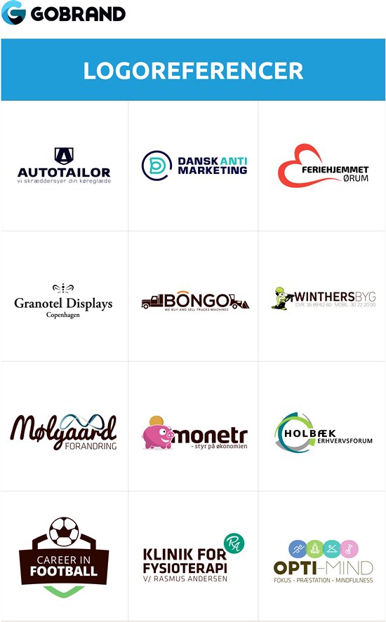 Mangler din virksomhed et logo eller en grafisk identitet? Så er GoBrand klar til at hjælpe dig! Sammen med dig tager vi en snak vedr. dine forventninger, krav og hvem din målgruppe er. Derefter udarbejder vi et par skitser til, som vi snakker udfra. På den måde sikre vi, at vi ikke designer i den forkerte retning i forhold til dine tanker og krav. Når vi har sporet os ind på stilen, arbejdes der i dybden med bomærke, logotype og farver. Med i pakken får du: - Logo klar til tryk - Logo klar til web - Logo i farve - Logo i sort/hvid - Formater: JPEG, PNG, AI, EPS og PDF Pris for logo kr. 2.500,- Mads Slivsgaard - mads@gobrand.dk - +45 41 24 36 00 Her er et udpluk af logoer vi har lavet: |