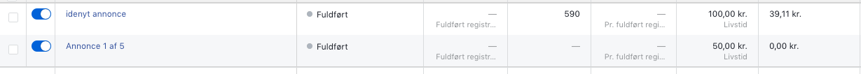 Angående den anden annonce hvor der er brugt 39 kr, så det kan være fordi at fb vurderer at det er dumt for mig at bruge flere penge da den ikke har givet nogle konverteringer endnu?