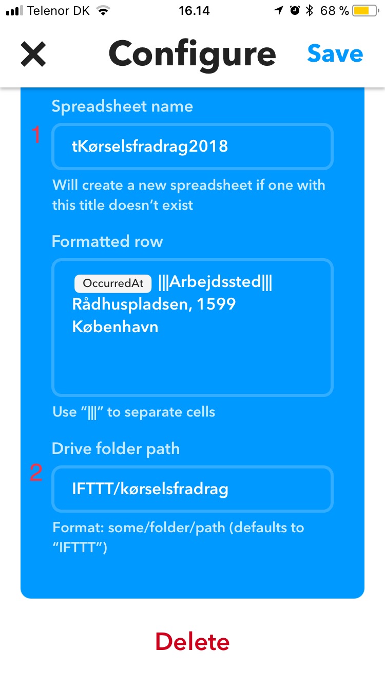 Jeg har lavet en funktion, hvor jeg bruger lokarionstjenester til at skrive en ny linie i et Google sheet (Googles gratis regneark), der gør følgende: Tjek om jeg ankommer til en bestemt adresse, og skriv så en ny linje i mit regneark. Indholdet i den linje er datoen, Arbejdsgiver og adresse. Derefter laver jeg en funktion, i arket, der tæller hvor mange gange jeg er på den enkelte arbejdsplads. For at tælle kunne tælle flere arbejdspladser, har jeg lavet en ny funktion (applet), der skriver til samme regneark (hvor adresse mm. selvfølgelig er rettet). Herefter er det blot at regne ud, hvad fradraget bliver. På den her måde ved jeg PRÆCIST hvor mange dage jeg har arbejdet på den pågældende adresse, samtidig med at jeg kan dokumentere det over for skat. Tilmeldt dig også gerne, da jeg har planlagt nogle lidt mere detaljerede videoer, med forklaring på hvad ifttt er, og tricks til sheets Sig gerne til hvis i har spørgsmål, så står jeg gerne til rådighed. |