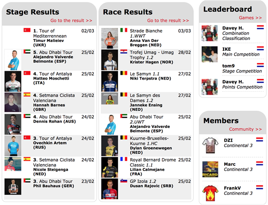 Jeg blev inspireret af denne side, som indeholder meget af det, som jeg gerne selv ønsker på mit website.. http://www.cyclingfever.com/ (eller se billede).