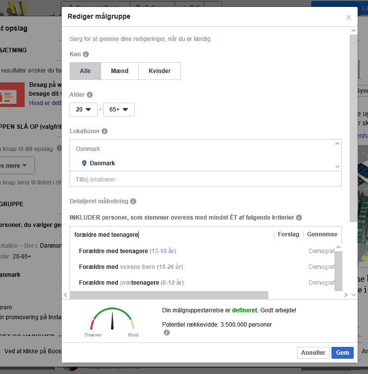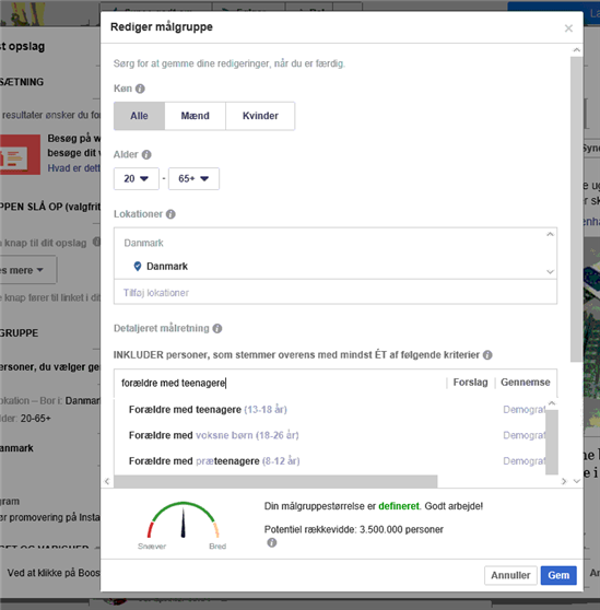 I facebook kan du lave en annonce og oprette en målgruppe der hedder Voksne mellem 35-60 f.eks. og så "Forældre med teenage-børn". Facebook's målgrupper er ret præcise. Prøv at se screenshot.
