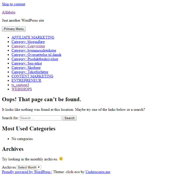 Hvis jeg går fra virksomheder under "sådan virker det" til "sådan virker det - Tekstforfattere", så ender jeg inde på en "fejlside (billede er sendt med)", da jeg ender under URLen https://alfabeto.dk/ans%C3%B8g