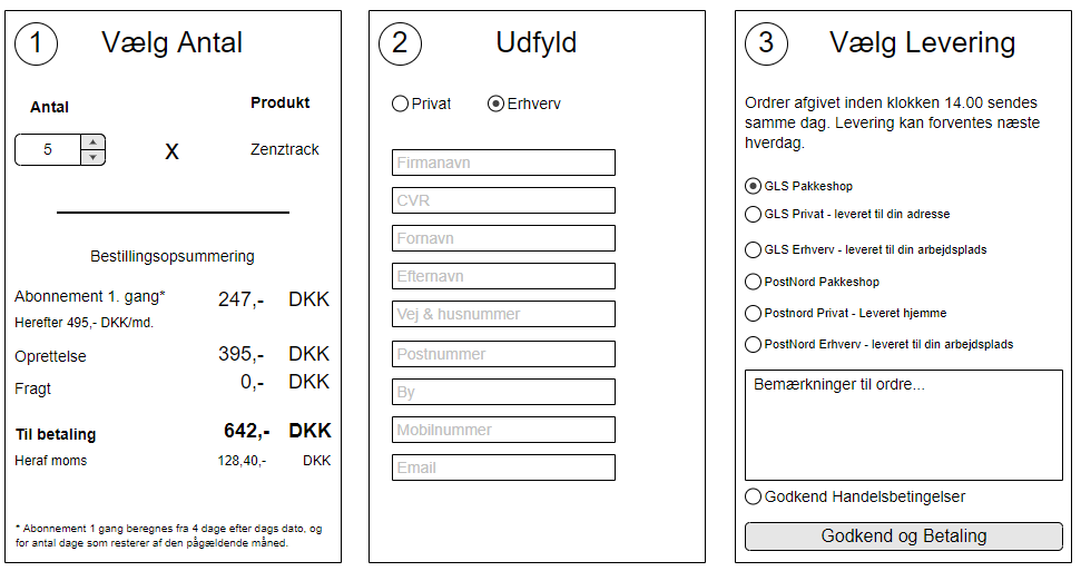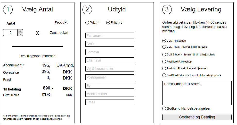 Hej Jeg er ved at lave et udkast til min webdesigner af vores checkout page. Vi sælger et abonnementsprodukt, og jeg er lidt i tvivl om, hvordan jeg skal præsentere prisen på checkout siden så den både overholder krav og ikke er forvirrende. Produktet er en GPS tracker med tilhørende abonnement. Vi beregner første måneds abonnement pro rata, altså hvis kunden bestiller den 20. i måneden, så opkræver vi kun for 10 dage første gang. Jeg har kopieret 2 muligheder ind herunder. Kom gerne med en kommentar på hvilken I ville foretrække. Samt, om I mener der er nogle krav som ikke bliver overholdt. Mulighed 1 Mulighed 2 |