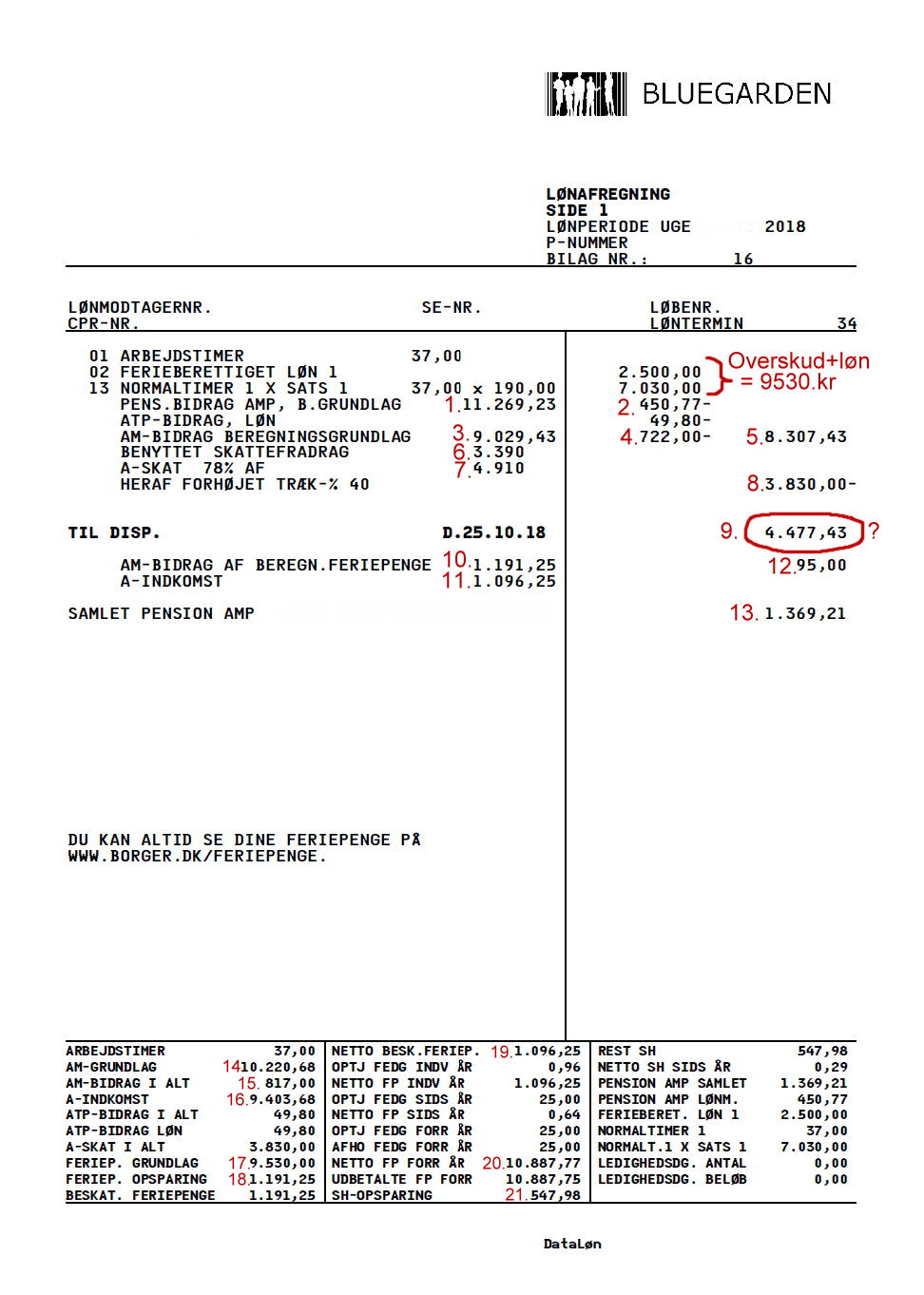 Hej Jeg sidder pt. og gennemgår min ven's lønseddel med dv. fejl og mangler, og har brug for din/jeres hjølp i den forbindelse. Tjek vedlagt links til lønseddel her: https://ibb.co/cDoLkq Umiddelbart, ud fra min egen udregning, ser det ud til der er bleven udbetalt for lidt (små 1000 +/-) og trukken 78% i skat og ikke 40%.. eller??? Og ... Jo, arbejdsgiveren er bleven gjort opmærksom på problemstillingen og kigger på sagen. Men, der hvor jeg har brug for din/jeres hjælp, er en vinden, forståelsen og en regnemodel til den generelle udregning af de forskellige poster på lønsedden. (nr 1-21) Kort sagt.... Hvordan ser de enkelte regnestykker ud, og hvordan kom man frem til dem? Ud fra lønsedden er feriepenge på 12,5% (nr.17-18), nok den eneste post, som bare giver lidt mening. 9530.kr/100 x 12,5% = 1191,25.kr Resten af posterne er lidt af en jungle, at finde ud af.... Især post (1).. Hvor kommer lige det tal fra, når den samlet løn er på 9530.kr??? I post (1) er beløbet 11.269,23. Hvorfor? Hvad bliver lagt til... Hvorforl og hvordan? Dernæst kan jeg se fejl i benyttet skattefradrag (nr. 6) på 3390.kr (14-dage) Og hvordan lige arbejdersgiveren er kommet frem til søgnehelligdagsbetaling (SH) på 547,98.kr (21) er mig en total gåde i forhold til en procentsats på 9,15% Så, om ikke andet, håber jeg der er nogle kloge hoveder, som kan gennemgå lønseddelen trin for trin og hjælpe mig med at udspecificere lønseddelen i et forståligt sprogbrug og udregning af de forskellige elememter fra lønseddelen: På forhånd tak. McBobo |